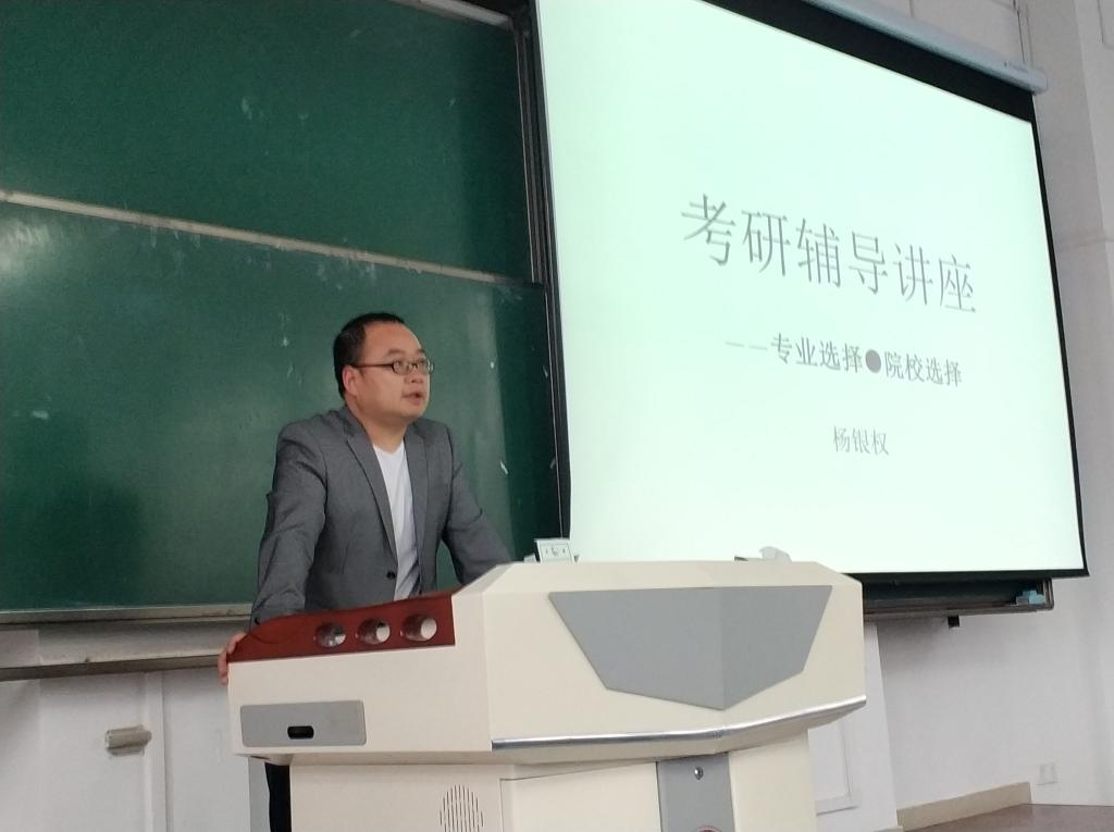 会上,杨银权介绍了本次讲座的目的和主题,并根据多年的教学经验,向同学们介绍了不同方向研究生的特殊要求以及研究生面试技巧,并结合具体案例,为同学们讲述了考研复习过程中各方面的注意事项。强调报考时结合自身情况,要客观评估自己的实力,综合考虑竞争情况。最后提醒各位同学,要调整好学习心态,不盲目地他人比较,合理安排学习时间,不打持久疲劳战。讲座最后,杨银权耐心地解答了大家的疑问,并针对性地介绍了一些学习方法和参考书籍,希望同学们能自信面对考研,自信面对未来。