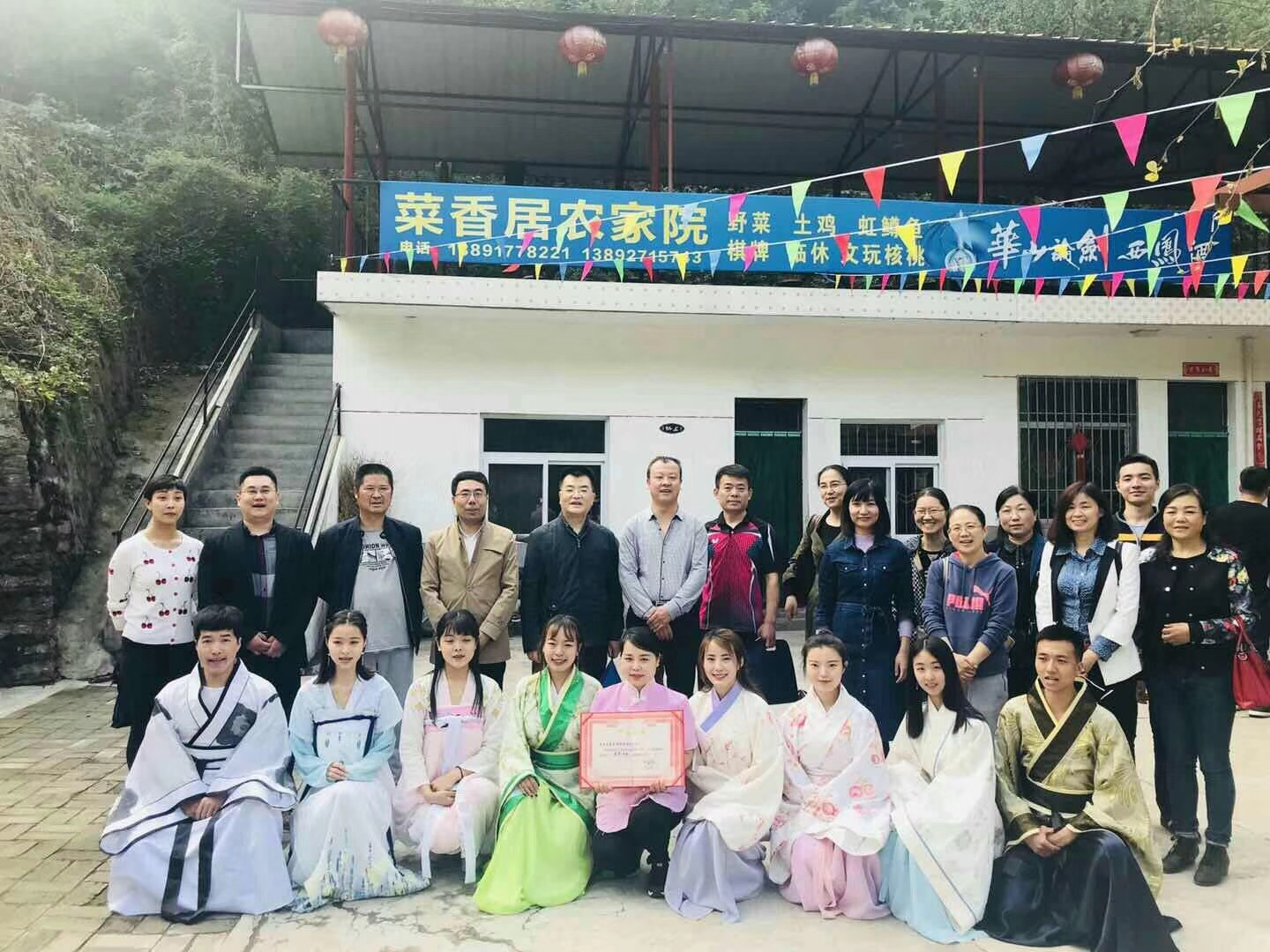 师生一行人最先到达了解甲滩村委会,稍作停留,又前往参观中华蜂蜜养殖基地。中华蜂蜜是百花蜜,又称野蜂蜜,是解家村的原生态特色产品,具有无污染、纯天然、营养价值高的特点。赵建昌老师在与蜂农交流之后得知解甲滩村民于2016年8月成立了农业合作社,建立了“神蜜缘”这一品牌,年产量3吨,单价88元每斤。赵老师表示养殖中华蜂蜜是扶贫的最好方法。百闻不如一见,百赞不如一尝,热情的解甲滩领导及村民邀请了师生一行人品尝了美味营养的中华蜂蜜,确实是与众不同,富有原生态的味道,可见其发展前景之广阔。接下来我们北格文旅着汉服的同学在中华蜜蜂养殖基地留影纪念,大力宣传解甲滩的中华蜂蜜。