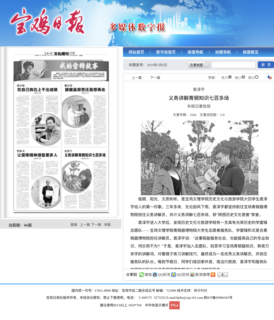 近日,必赢“青铜器博物院大学生志愿者服务队”袁泽宇同学接受《宝鸡日报》记者采访,“义务讲解青铜知识七百多场”先进事迹在《文化周刊》——“我的雷锋故事”中报道。