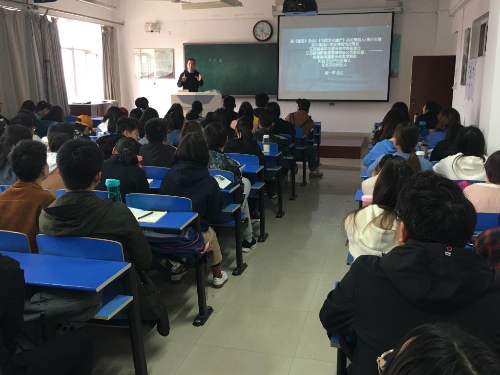 吴一平先生是知名的文化创意策划及文化经纪人,先后通过《鉴宝》和《中国文化遗产》等传统媒体平台而成功介入文化产业、艺术品市场、文化资本运营、文化人才培养、区域文化形象营销等领域,为文化产业发展做出了一定贡献。吴一平先生现身说法,为学生讲述了自己成功的文化运营案例和文化创意成就,对学生专业学习带来了一定的启发,对于文化产业管理专业学生树立专业信心和投身于文化创意产业发挥了一定作用。