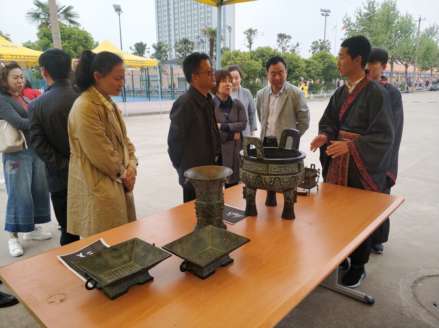 活动在437bwin必赢国际官网青铜器博物院大学生志愿者服务队与汉服社优美的舞蹈中拉开了帷幕。本次活动内容丰富多样,分为比赛活动和体验活动两个项目,具体包括投壶、飞花令、射箭、猜字谜、DIY风筝、茶艺茶道、周秦文化展示、戏曲艺术展示、以及撰写金文等。过往的师生们都被活动所吸引,现场气氛热烈。在揖礼和拱手礼体验区和撰写金文区,更是人头攒动,留学生也纷纷参与金文的书写,感悟汉字的博大精深和无穷魅力。同时,活动主办方与承办方也为参与的师生赠送了体验卡、DIY风筝、团扇等纪念品,极大的提高了广大师生的参与度。栾宏、冯森、兰佳等老师也积极参与各项活动,听取青铜器讲解,观看揖礼、茶艺等表演,还体验了金文书写,他们鼓励学生们要努力学习历史文化知识,依托各自所学专业知识积极弘扬中华优秀传统文化。