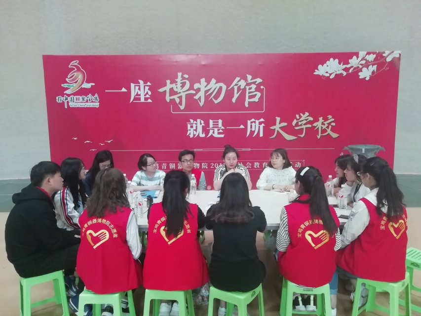 青铜器博物院大学生志愿者服务队负责人苏元元与大家一同回顾了五四运动的相关史实,鼓励大家以史为鉴,以担当的本领、作风积极做好志愿服务工作,并带大家讲解了青铜器博物院镇馆之宝何尊及历史上的“中国”二字的由来,加强了志愿者之间的相互交流学习。