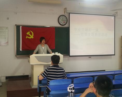兰佳首先对2019届全体毕业生党员在学习和生活等方面处处发挥模范作用,最终以优异成绩完成学业,并顺利毕业表示祝贺。她指出,在大学不仅仅要学习科学文化知识,而且还要不断丰厚人生阅历,树立正确的世界观、人生观和价值观。随后,兰佳从什么是共产党员的初心和使命,做“四讲四有”合格党员的标准以及如何在今后的生活学习中践行等三个方面为同学们讲了党课并对即将离校走向社会或进入更高学府深造的青年党员,提出三点希望:一是理论学习与传统文化知识学习相结合。二是理论学习和工作岗位工作内容相结合。三是理论学习和宗旨意识、责任意识相契合。接着,在张波老师的带领下,全体党员重温了入党誓词。最后,兰佳向毕业生党员赠送了纪念品,希望毕业生党员们牢记党员使命,不忘初心、砥砺前行。(文\张波)