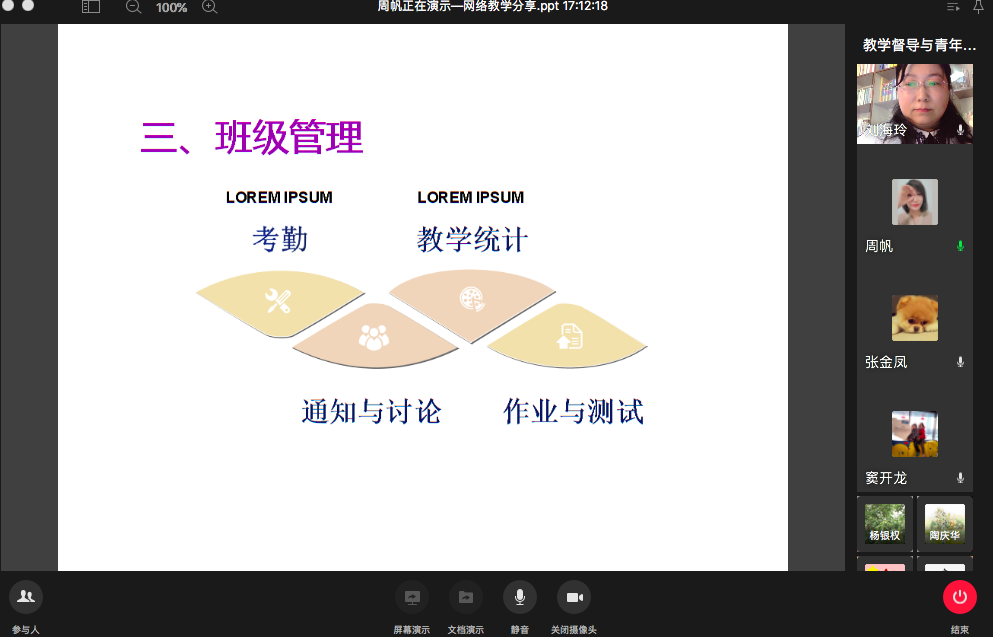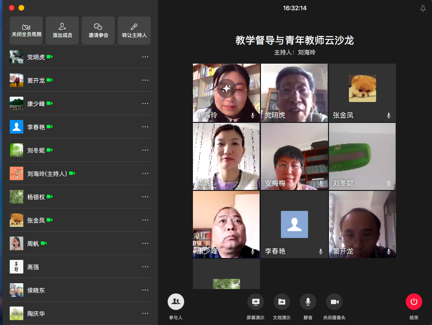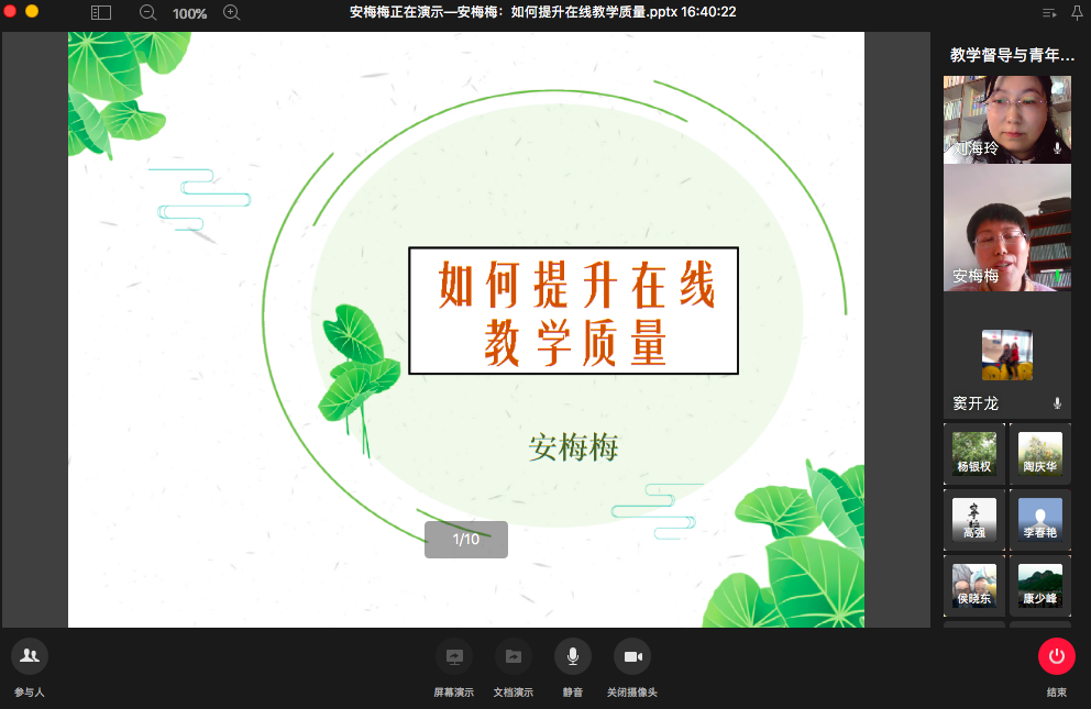 会议进行中,先由两位青年教师就个人网络教学进行实例展示。安梅梅老师采用的是雨课堂结合腾讯会议、以直播为主的授课方式,她就课前、课上、课后环节的安排,教学组织、与学生互动的实际情况进行了说明;周帆老师主要采用录播加线下资料结合的方式,她从教学平台的使用与教学方法、课程建设、班级管理三个方面谈了自己网络课程的实践和心得。随后老师们参与讨论,大家发言踊跃,畅所欲言,共同的感受就是:随着疫情突发,网络教学成为当务之急,经历了开课前的匆忙应战,克服了硬件不足,平台选择困难、教学资源不足等的难题,到正式授课过程中的各种尝试、调整,目前已经基本拥有了一套较为顺手的网络教学方法。对于如何提高网络教学质量,大家献言献策。杨银权教授提出可以通过线下和线上的衔接,减少直播量,结合线下预习、作业等的方式来加强对学生的学习进度和程度的管理;陶庆华老师谈到利用网络平台和资源有其不可替代的优越性,教学效果良好,但是不同班级的教学效果差异较大,需甄别对待。李春艳和刘冬妮两位老师都认可网络教学有其优势,学生的学习积极性和参与度都很高,但也存在网络平台受限和少数学生学习状态不能很好监管等问题。侯晓东老师提出关于网络平台中存在的知识产权保护问题。张金凤老师通过近期举行的阶段性考试的分析认为:前期的网络教学效果还是比较理想的,网络平台给教师的备课、考核和教学的信息化管理提供了很多便利。最后,校级教学督导党明虎老师进行了总结发言,他认为突如其来的疫情倒逼着老师们接受挑战,使混合式教学成为一种势在必行的新形势,大家共同解决了各种各样的困难,做到了停学不停课;面对新的形势,教师们应当务实创新,将提升网络教学质量落到实处;同时也提出,作为教学督导,也要适应形势需要,转变工作方式,从以“督、导”为主,转变为鼓励、帮助和提供服务。