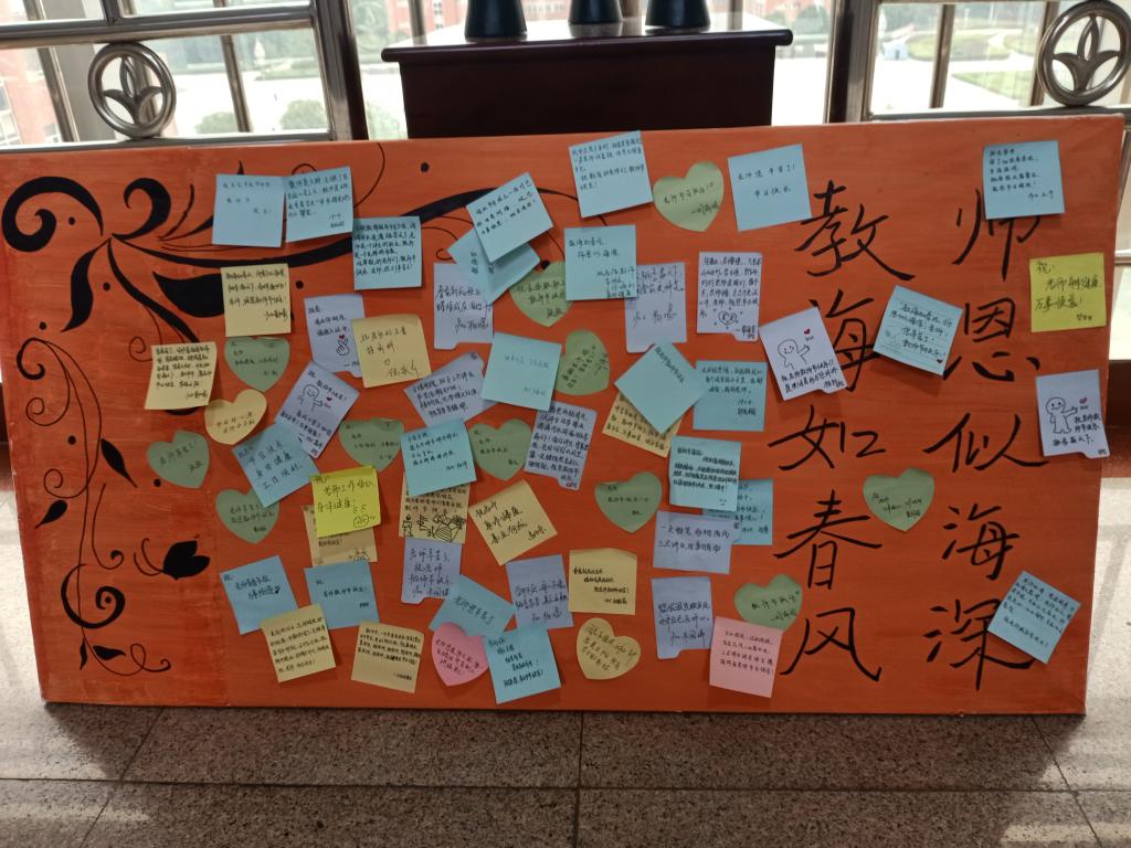 活动期间,同学们采用了多种方式形式为老师送上祝福。课前为老师送水、起立问候等方式表达敬意,促进师生关系融洽。各班同学也在便签上写下了教师节祝福。另外,制作教师节主题板报、举行“我与老师的故事”主题征文活动、参与“我与老师的故事”征集活动引起同学们对教师节的关注,抒发学生对老师的诚挚敬意,加深对老师的敬佩之情,增强教师的自我认同感。