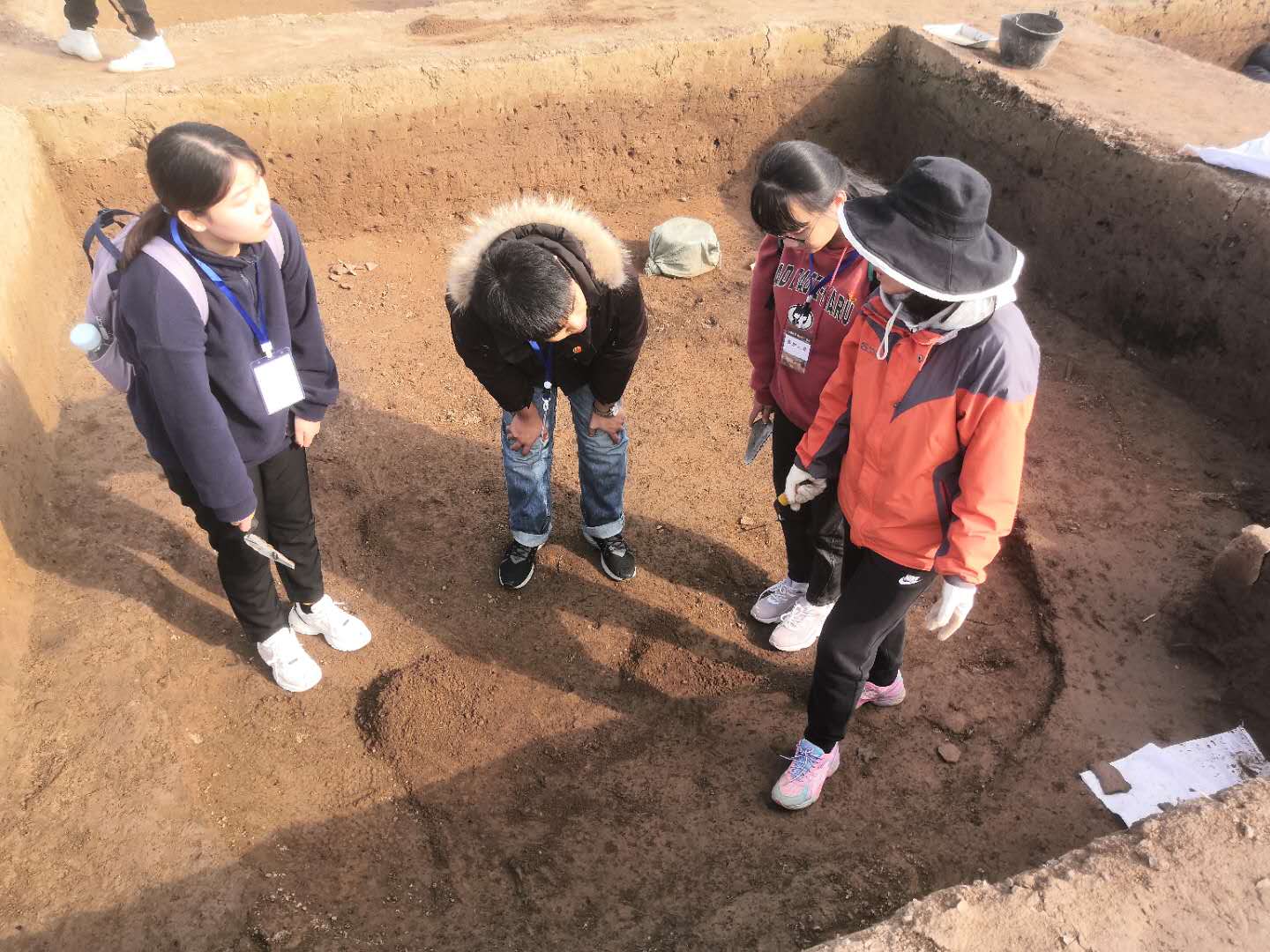 下午,师生们走进周原博物院,参观了《赫赫宗周 万邦之方——周原遗址考古成果展》主题展,青铜国宝、卜骨、玉器、编钟等四千多件精美文物在大家面前展开了一副三千年前西周人的社会生活全景,记录传达着周人开创的赫赫辉煌和自强不息的民族精神,师生们为这块土地上承载的厚重历史赞叹自豪。随后大家来到距离博物院不远的周原考古现场,在北京大学考古文博学院助理教授曹大志老师的指导下,和北大2018级正在考古实习的同学一起在探方里进行挖掘体验,探讨交流,仔细观看清理出的陶鬲、碎片、民居遗存等,加深对考古的了解和认知。