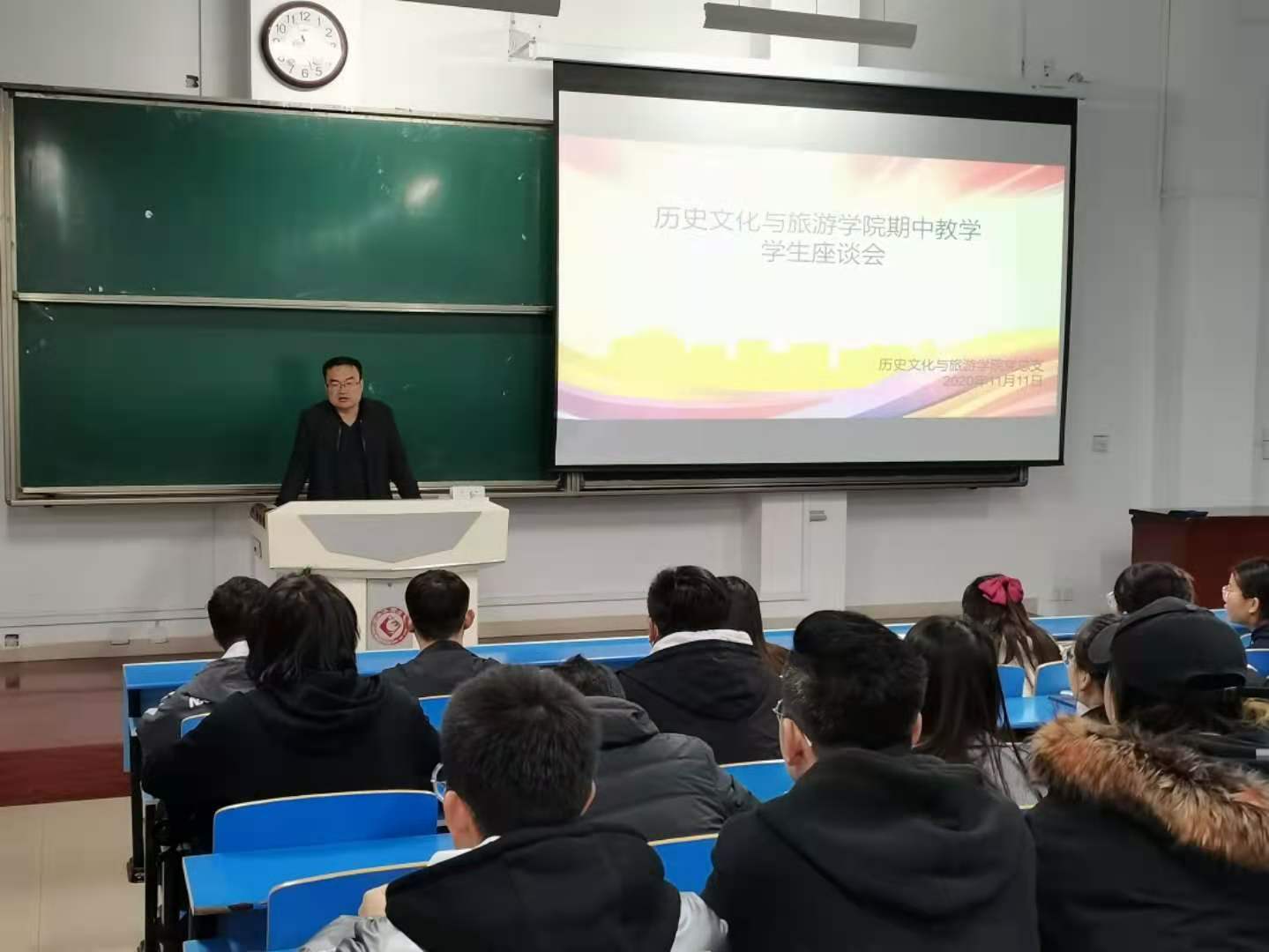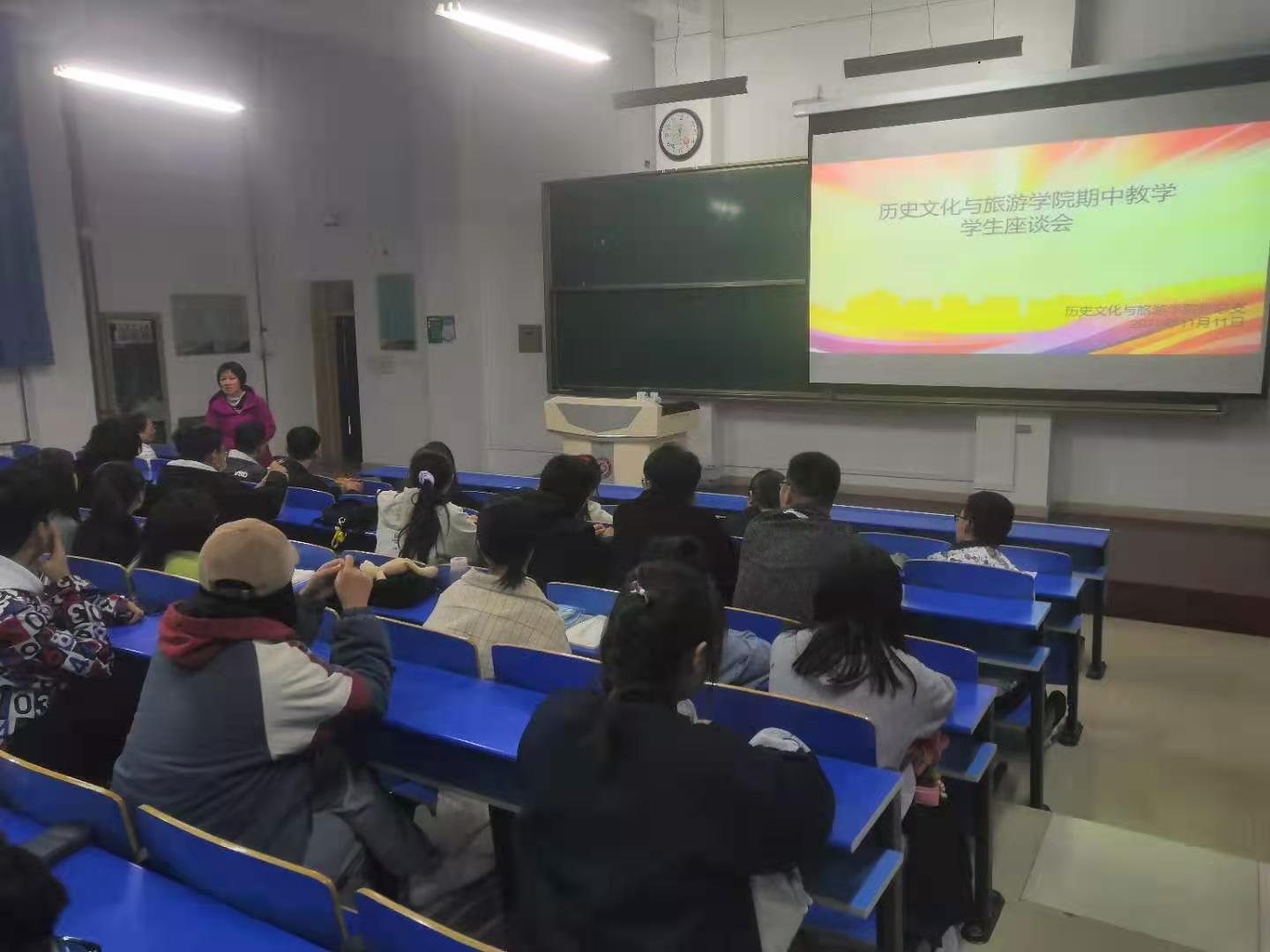 11月11日下午,学院在立心楼520教室召开期中教学检查学生座谈会。党总支书记兰佳、历史系主任杨银权、旅游管理系主任徐丽平、辅导员张波及各年级各专业的学生代表40余人参加了本次座谈会。张波主持会议。