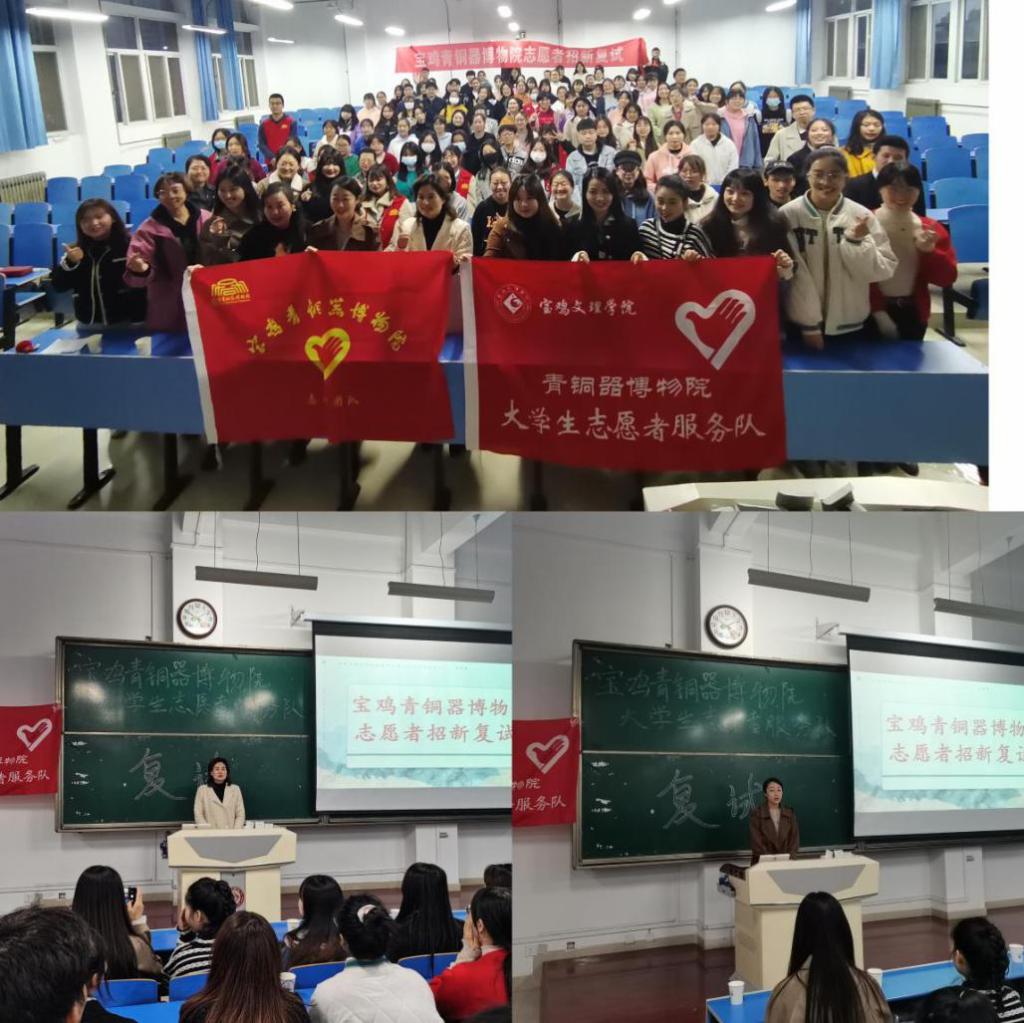 10月15日下午,437bwin必赢国际官网在立心楼508室开展“宝鸡青铜器博物院大学生志愿者服务队”招新活动。宝鸡青铜器博物院宣教部主任翟慧萍、宣教部副主任王睿、学院党总支副书记、副院长罗燕、学院团总支书记于乐及招新的100余名同学参加了本次活动。会议由宝鸡青铜器博物院大学生志愿者服务队队长胡雪融主持。