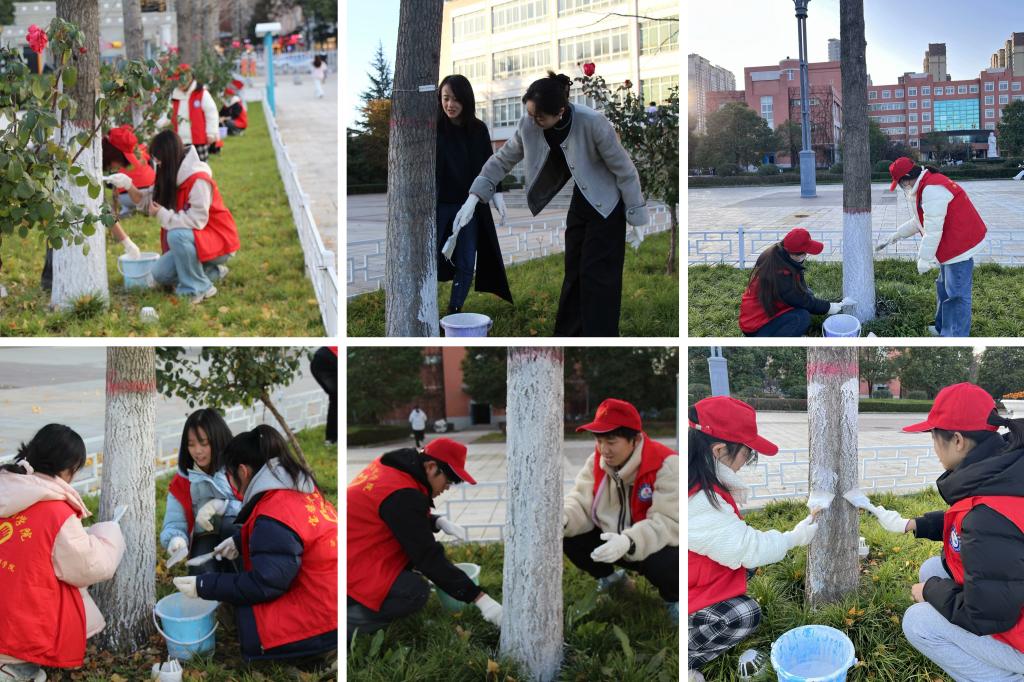 活动中,同学们身着统一服装,手持盆桶,分组对图书馆北门广场两侧的树木进行了精心涂白。现场忙碌而有序,同学们或刷红边、或涂白干,或忙着运送物资,每一棵树都被细心地披上了白色的“防寒服”。这不仅为树木提供了有效的保护,更在视觉上带来了清新整洁的美感,成为校园中一道亮丽的风景线。