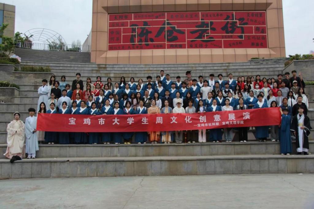 4月26日上午,受宝鸡市社科联邀请,437bwin必赢国际官网学生代表组成的文艺演出团队,在宝鸡市太阳市陈仓老街文化广场开展了“赓续千年文脉,传承礼乐文明”大学生周文化创意展演活动。