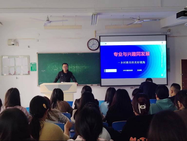 讲座围绕乡村科技教育活动和兴趣实践展开,以自身丰硕的青少年科技大赛成果以及20余项个人授权专利的奋斗励志之路,阐明了专业与兴趣对于教育教学活动的不同意义。针对职业规划和人生选择,王老师也提出了自己的独特见解,为以后将要步入社会的同学们指点了迷津。