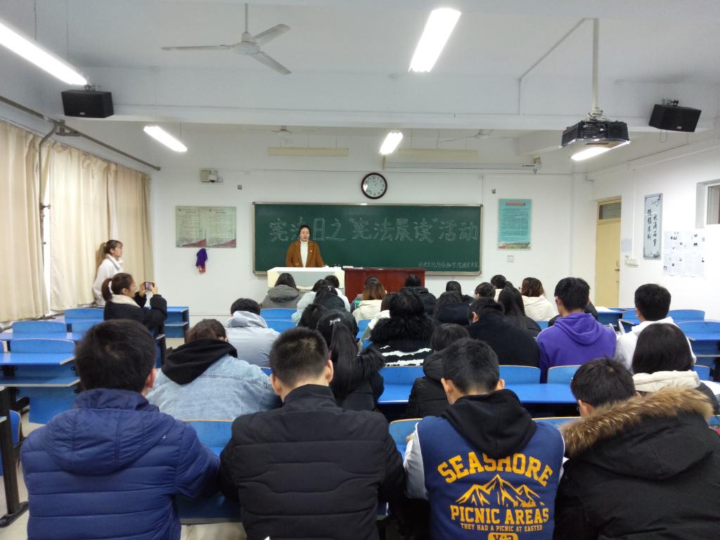 首先,同学们宣读了宪法的部分内容,对宪法有了进一步了解;接着,于乐讲到,宪法是国家的根本大法,作为当代大学生,我们更应知法懂法。随后她指出希望同学们课后可以通过更多形式学习相关法律知识,增强法制观念,提高法律意识。最后她说到,知法懂法对于即将步入社会的同学们更有必要,要求同学们通过更深层次的学习,保护自身利益,体会宪法的重要性。