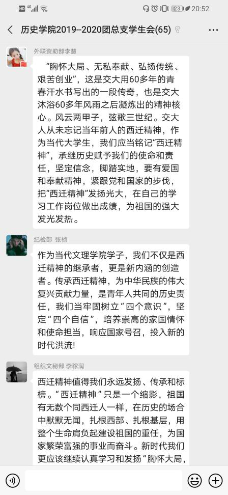 此次活动通过视频学习、交流分享心得感受等形式开展。必赢充分利用新媒体平台,组织团总支、学生会全体成员线上参观西安交通大学西迁博物馆并学习习近平总书记来陕考察重要指示精神和五四寄语,在交流群中讨论分享个人感想与心得。