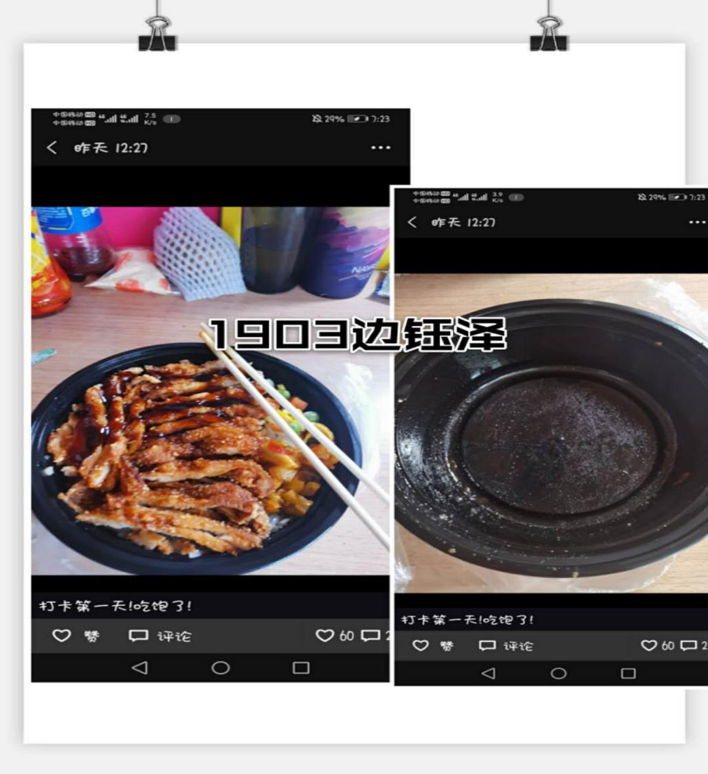 本次活动内容分为三个部分。一是,征集“节约粮食,反对浪费”的小标语并张贴在教室楼道内;二是,将有关节约粮食的知识打印成宣传单,组织本院同学在校内宣传节约粮食的知识;三是,同学们将一日三餐中的任意一餐进行拍照打卡,记录餐前和餐后的对比情况,并上传至朋友圈,最终将每日的点赞、评论情况截图,持续一周。同学们踊跃参与,部分同学获得奖项。张艺谋等6名同学获得一等奖;边钰泽等6名同学获得二等奖;闫怡飞等8名同学获得三等奖。