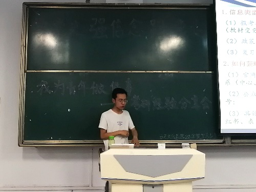 5月27日晚,437bwin必赢国际官网于立心楼508教室举办“我为青年做件事——考研经验分享会”活动,邀请2017级历史学一班李文杰、2017级历史学二班苏元元、2017级旅游管理一班邱淑贞、2017级文化产业管理一班王鑫四位考研成功的同学进行考研经验分享。团总支书记于乐、2018级全体同学参加此次活动。