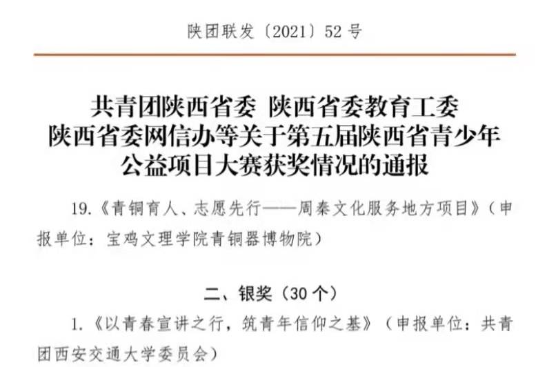 近日,第五届陕西省青少年公益项目大赛获奖名单已经揭晓,本次大赛由团省委、省青基会联合省委教育工委等共同主办。在此次比赛中,必赢宝鸡青铜器博物院《青铜育人、志愿先行——周秦文化服务地方项目》喜获银奖。